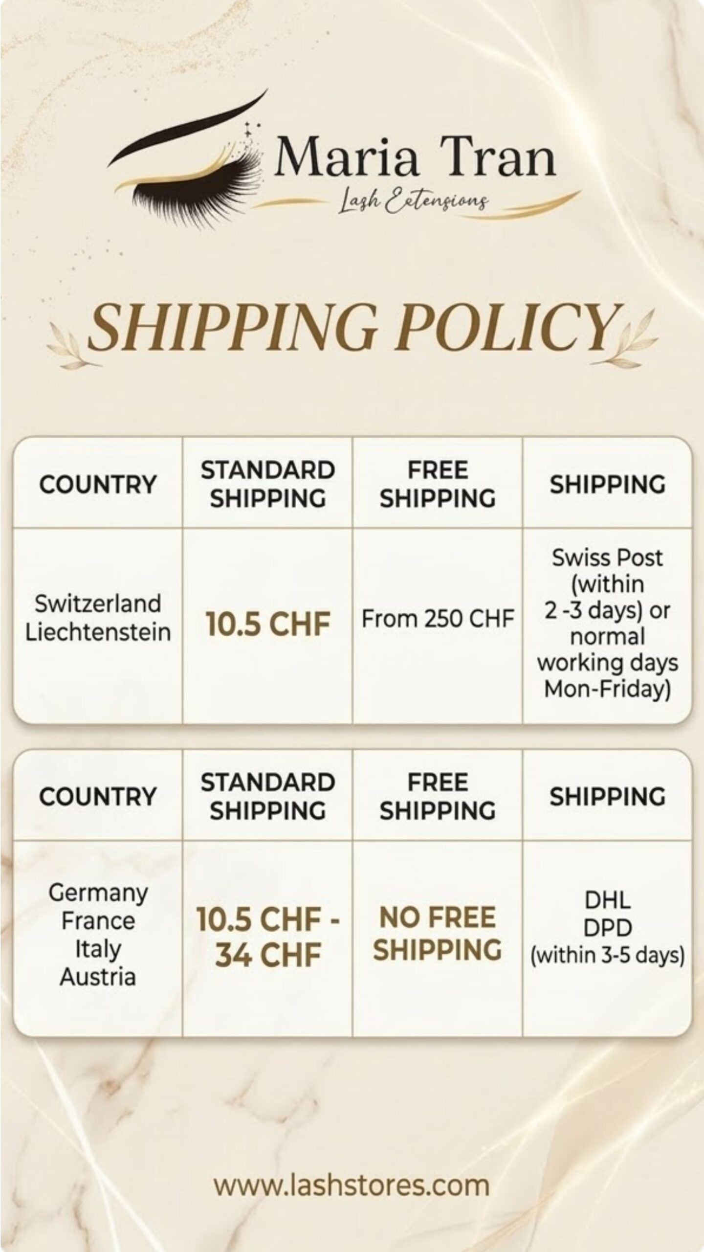 At Maria Tran Lash Extensions, we strive to provide a seamless and reliable shopping experience. Below are our shipping options, rates, and estimated delivery times.